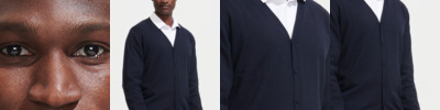 49% cotton/49% acrylic/2% polyamide. Set in sleeves. Six self colour buttons. Ribbed trim with elastane at cuffs and hem.