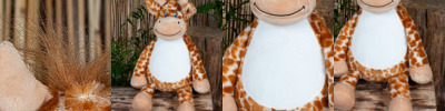 Soft plush zippie giraffe. Contrast hooves, nose and horns. Sewn eyes and mouth. Contrast mane and tail. White panel on tummy perfect for decoration. Zip access on base for direct access onto the tummy for decoration. Removable inner stuffing. Can be embroidered, printed and sublimation printed. Complies with EN71 European Toy Safety regulations. Remove all hang tags and their fasteners before giving these items to a child. Suitable for all ages. BSCI certified. SEDEX certified.