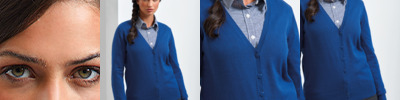 55% cotton/45% acrylic. Fine knit. Easy care. Soft feel and contemporary styling. Set in sleeves. Seven self colour buttons. Machine washable at 40°C.