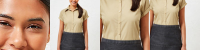 3.3 oz. 55/45 cotton/polyester; 2 chest pockets, button flaps; Front stitching and on yoke; Blue & red have black inner collar; Hem sleeves and bottom; modern fit with roll up sleeve placket;