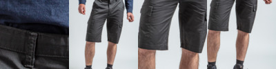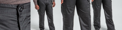 65% polyester/35% cotton. Part elasticated waistband with belt loops. Zip fly with stud over. Two front tradesman pockets. Two side pockets. Rear patch pockets. Two multi-use side leg cargo pockets. Ruler pocket. Media pocket. Hammer loop. External tear release knee pad pockets. Twin needle hem.