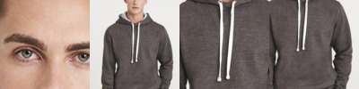 52% ringspun cotton/48% polyester. Soft cotton faced fabric. Brushed back fleece. Drop shoulder style. Double fabric hood with heather grey waffle fabric inner. Chunky white flat lace drawcord. Two front pockets. Deep ribbed cuffs and hem. Overlock stitching detail. Tear out label.