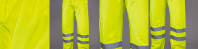 100% waterproof 300D polyester with oxford PU coating. Conforms to EN ISO 20471: 2013 + A1: 2016 class 1 (yellow only). All colours conform to EN343: class 1. Stitched and taped seams. Elasticated waistband. Two side pockets. Two reflective bands around lower legs. Open leg ends with stud adjusters.