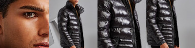 Wide external central storm flap with concealed coil zip, signature zip puller and internal storm flap with chin guard. Chunky rubberised stud fastenings on centre front. Horizontal stitched graded baffles. 245gsm polyester fill. Fully-lined in polyester matt finish. Self elasticated cuffs. Tonal coil zipped pockets with upper zip guard and self fabric piping around edges with rubberised edge trim. Glossy high shine face fabric. Internal double jet chest zipped reverse coil pocket. Product contains no branded neck label.* Removable Kimble or looped garment tags. Inner seam label holds important product information on one label with a second label containing brand information which can be cut-away.