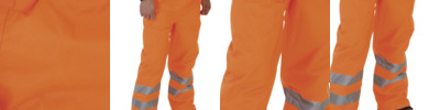 80% polyester/20% cotton twill. Yellow/navy and orange/navy conform to EN ISO 20471: 2013 + A1: 2016 class 1. RIS-3279-TOM (orange only). Navy provides enhanced visibility. Water repellent finish. Part elasticated waistband with belt loops. Zip fly with button over. Two side pockets. Rear tear release pocket. Two side leg cargo pockets with reflective tape. Inner knee pad pockets. Two reflective bands around lower legs. Contrast lower leg panels.