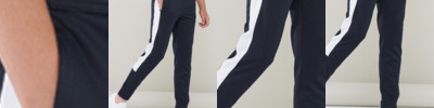 100% polyester interlock. Slim leg. Elasticated waistband. Two side zip pockets. Contrast side panels (black and navy are self colour). Ankle zips with zip guard and semi-automatic lock zip sliders.
