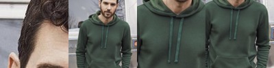Raglan sleeve. Double-layered hood in self-fabric. Round drawcords in matching body colour with metal tipping. Metal eyelets. Inside herringbone back neck tape. Self-fabric half-moon at back neck. Slanted side seams with pockets. 1x1 rib at sleeve hem and bottom hem. Flatlock top-stitch on all seams.