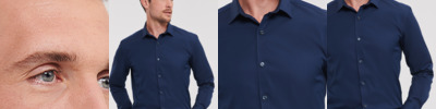 75% cotton/25% elastomultiester (LYCRA®T400®). Easy care, moisture management fabric.Fitted style.Semi-cut away collar.Narrow placket.Plain yoke.Square edged two button adjustable cuffs with button on cuff gauntlet.Option for cuff links.Curved hem.