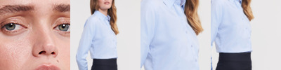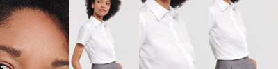 3.4 oz., 55% cotton, 45% polyester broadcloth; Fine yarn count shirting; True non-iron performance straight from the dryer; Stain release finish; true Non-iron performance straight from the dryera; Pearlized buttons; Patented pucker-free taped seams; Specially fused collar, cuffs and placket; Split back seam with bias cut back yoke; Straight collar; Sront and back princess seams for a feminine fit; Bust darts for a feminine fit;