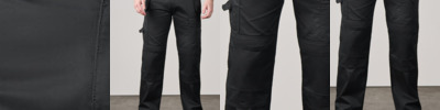 Zip fly front fastening. Part elasticated waist band with belt loops. Two side front tradesman pockets. Two upper leg utility pockets, right hand side ruler pocket, left hand side utility and phone pocket. External knee pad pockets with tear and release fastening. Two back patch pockets. Hammer loop. Twin-needle stitching on hem.