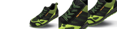 Flyknit polyester mesh. Suede trim.Moisture wicking lining.EN ISO 20345: 2011 SRA SB.Lightweight, unisex low cut sports trainer style.Breathable.Steel toe cap.Double density PU/PU sole.SRA slip and oil resistant outsole.Energy absorption heel.Padded tongue and collar.Heel loop.Spare insole set.