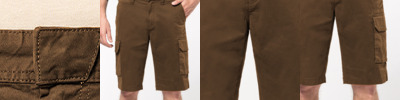 80% polyester/20% cotton twill. Water repellent, windproof and breathable.Double tab belt loops.Partially elasticated waistband.Zip fly with button over.Two side pockets.Rear pocket.Multi-use cargo pockets with reflective tear release tabs.Bar tack stress points.