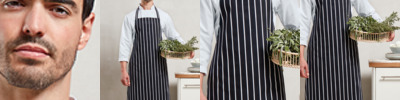 65% polyester/35% cotton. Printed 'butchers' style stripes.Self fabric neckband.Self fabric 90cm ties.Width 72cm.Length from waist 71cm.Total length 101cm.Industrial laundry 85°C.Domestic wash 60°C.