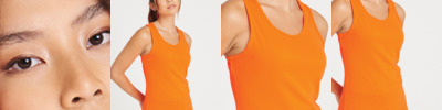 Girlie fit. Neoterictmtm textured fabric with inherent wickability. UPF 30+ UV protection. Racer back style. Self fabric bound neck and armholes. Curved back hem.