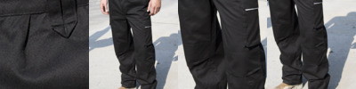 65% polyester/35% cotton. Windproof.Expandable waistband with belt loops.Zip fly with button over.Handwarmer side pockets.Rear pockets.Cargo pockets on both legs.Hammer loop.Critical stress point bar tacking.Twin needle stitched seams.