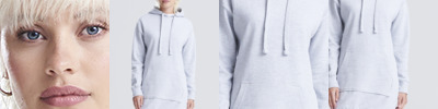 75% cotton/25% polyester. Jet black 80% cotton/20% polyester.Heather grey 75% cotton/25% polyester.Soft cotton faced fabric.Brushed back fleece.Drop shoulder style.Relaxed ladies fit.Double fabric hood with self colour flat lace drawcord.Taped neck.Front pouch pocket.Long length.Ribbed cuffs and hem.Twin needle stitching.Tear out label.