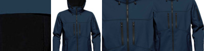 Two layer soft shell. 100% polyester.Soft jersey fabric with bonded micro fleece reverse.Three panel hood.Contrast shoulders and upper sleeve panels.Full length contrast zip with non-slip gripper zip pulls.Contrast right chest and two front zip pockets.Top stitched side panels.Stretch bound cuffs and hem.Drop hem.