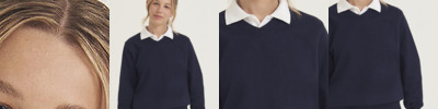 V-neckline sweatshirt. Ribbed neckline, cuffs and hemline. Soft cotton faced fabric creates ideal printing surface. Name label at back neck. Taped neck. Twin needle stitching for durability.