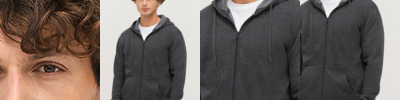 50% cotton/50% polyester. Brushed back fleece.Drop shoulder style.Hood with self fabric drawcord.Full length zip.Front pouch pockets.Ribbed cuffs and hem.