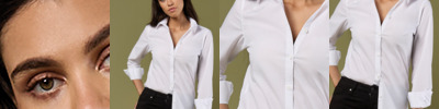 65% polyester/35% cotton. Easy iron fabric.Soft fused stand up collar.Self colour buttons.Back yoke.Bust and back darts.Single needle stitched armholes.Twin needle sleeves and side seams.Two button adjustable cuffs.Curved hem.