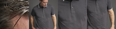 95% ringspun combed cotton/5% elastane. In transition to using organic cotton.Mini piqué.Fitted style.Contrast tipped flat knit collar and cuffs with elastane.Taped neck.Three button placket with self colour branded buttons.Side vents.Twin needle hem.