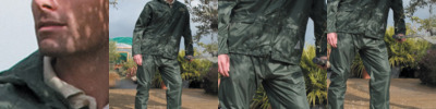 190T PVC coated StormDri 2000 polyester. Waterproof 2000mm with taped seams.Windproof.Hood with tear release closure.Jacket has full length zip, vented back, underarm ventilation eyelets, two front pockets, inner storm cuffs and adjustable drawcord hem.Reflective safety triangles to front and back.Trousers have elasticated waistband, slit access to pockets.Open leg ends with snap adjusters.Comes in zip closing branded carry bag.Cut out label.