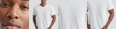 Rib v-neck. Self-fabric back neck tape. Fine knit gauge for enhanced printability.