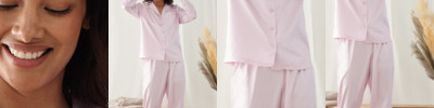 95% polyester/5% elastane. Shirt with notched collar.Self colour pearlised plastic buttons.Contrast piping around collar and centre front opening.Self fabric cuffs with contrast piping.Trousers have elasticated waistband with mock white drawcord.Contrast piping on leg ends.Twin needle hems.Tag free.