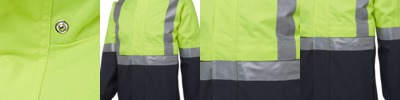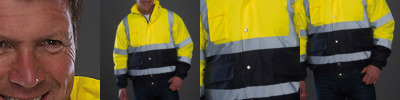 Hi Vis Yellow, Orange & Orange/Yellow conforms to EN ISO EN20471:2013 Class 3 & EN343 against foul weather. Orange also conforms to GO/RT 3279. Black and Navy provide enhanced visibility (non-EN471 standard). Heavy duty zip with studded storm flap. 2 outer pockets with over flaps. Matching colour self-fabric elastication at cuffs and hem. Diamond quilted Nylon lining with 190g Polyester padding. Inside patch pocket. Throughout stitched and taped seams to ensure waterproof. Foldaway hood. Matching trousers available, reference HVS461, HVS462 & HVS463.