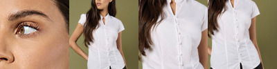 58% cotton/39% polyester/3% Lycra®. Fused stand up collar.Back yoke.Bust and back darts.Double stitched side and sleeve seams.Adjustable cuffs with button on cuff gauntlet.Curved hem.