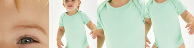 - Self fabric bound neck, arms and leg openings.