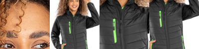 Recycled polyester outer. Polyester padding and lining.Repreve® recycled padding.Polyester micro fleece inner layer.Two layer mechanical stretch printable soft shell sleeves.Lightweight.Showerproof and windproof.Hanging loop.Full length zip with chin guard and inner zip guard.Contrast right chest zip pocket and two front zip pockets.Soft bound cuffs.Open hem.Tag free.Access for decoration.