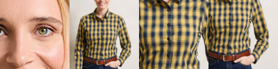 100% cotton poplin. Semi-fitted. Narrow soft collar. Back yoke. Bust and back darts. Roll-up sleeves with button and tab. Button cuff. Curved hem.
