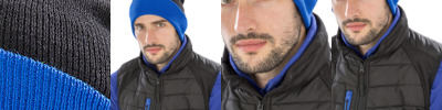 Beanie made from 50% recycled materials. Contrast colour deep cuff. Double thickness. Full size style. Soft-feel knit.