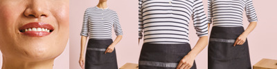 70% cotton/30% polyester. Easy care fabric.Contrast neckband with adjustable metal buckle.Contrast fabric ties with metal eyelets.Reverse contrast denim centre chest pocket and pen pocket.Lower front pocket and pen pocket.Width 72cm.Length 86cm.Industrial laundry 85°C.Domestic wash 60°C.