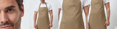 100% cotton twill. Self fabric neckband with buckle and adjustable stud closure.Three chino style stitched pockets with rivets.Width 72cm.Length 86cm.Industrial laundry 85°C.Domestic wash 60°C.