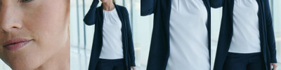 82% polyester/14% viscose/4% elastane. Single jersey.Easy care fabric.Soft and stretchy.White/navy has yarn dyed stripe.Ribbed bound collar and cuffs.Three button placket.Roll-up sleeves with button and tab.