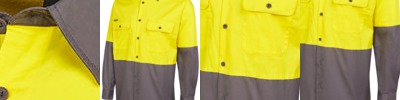 100% Cotton for 100% comfort,150gsm double pre-shrunk twill,Complies with Standard AS/NZS 4399:1996 for UPF Protection ( UPF 50+),Complies with Standards AS/NZS 1906.4:2010 and AS/NZS 4602.1:2011 Day Only,Two-piece collar,Wide back neck yoke with concealed mesh, cooling gussets at underarms,Two front pockets with button-down flaps and pen insert,Contrast panel on front, back, long sleeves and collar,Curved hem with back tail styling