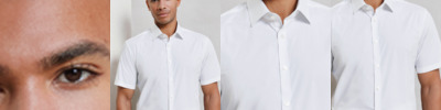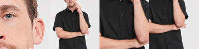 97% cotton/3% elastane. Soft feel stretch fabric.Fitted style.Stiffened cut away collar.Single button closure on collar stand.Grown on placket.Back yoke.Back darts.Curved hem.