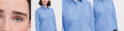 3.9 oz./yd² / 132 gsm, 60% cotton, 40% polyester dobby with wrinkle-free and stain-release performance; Stain-release and true non-iron performance straight from the dryer; Active fit; Patent pucker-free taped seams; Specially fused collar, cuffs and placket for total garment performance; Straight collar with built-in collar stays; Princess seams in front and back for a feminine fit; Fine yarn-count shirting with pealized buttons; Adjustable cuffs with button placket;