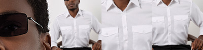 70% cotton/30% polyester. Easy care fabric.Semi-cut away boned collar.Plain back yoke.Double folded seams.Curved hem.