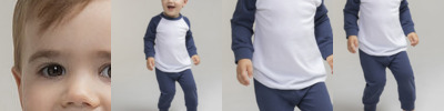 Baseball t-shirt with contrast sleeves and neck binding. Plain hem and cuffs. Twin needle stitching. Contrast plain pants with elasticated waist. Plain rib cuffs. Size tab only.