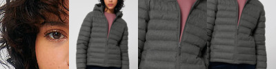 Wool-like women’s padded jacket. Set-in sleeve. High collar with detachable hood and matte metal hidden snaps. Hood opening and bottom hem with adjustable plastic stopper and elastic cord. Reverse nylon zip at centre front. Zipped welt pockets with extra grosgrain pull. Fully quilted. Side panels for better shape. Soft 1x1 rib at sleeve hem.