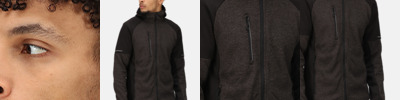 100% polyester knit effect fleece. Made from at least 30% recycled polyester (in transition). Contrast Extol stretch hood, shoulder, underarm and side body panels. Grown on hood with stretch bound opening. Full length zip with chin guard. Reflective detail on sleeves. Right chest zip pocket with reflective detail. Two front zip pockets. RFID pocket protection. Thumbholes on cuffs. Stretch bound cuffs and hem. Cut out label.