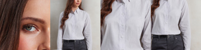 65% polyester/35% cotton poplin. Easy care fabric. Gingham check. Modern fit. Narrow soft, concealed button down collar. Bust and back darts. Single button cuffs. Curved hem.