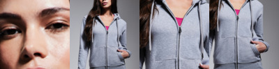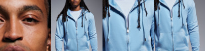 80% organic cotton/20% recycled polyester.* Soft cotton faced fabric. Brushed back fleece. Drop shoulder style. Slim fit. Double fabric hood with waffle knit lining. Self colour drawcord with nickel free eyelets and drawcord tips. Full length metal zip. Front pouch pockets. 2x1 ribbed cuffs and hem. Twin needle stitching. Unbranded size label at neckline.