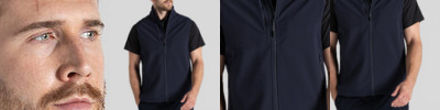 Water-resistant and windproof softshell vest with 3 pockets. Recycled polyester elastane softshell with EcoShield DWR finish. Striped microfleece back and recycled zip tapes.