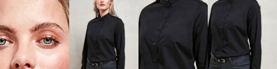 Classic banded ‘Grandad’ collar with top button fastening. Double-button cuff and sleeve guard. Bust, back darts and a curved hem. Pearlised buttons.