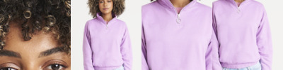 80% ringspun cotton/20% polyester. Soft cotton faced fabric. Brushed back fleece. Funnel neck with 1/4 zip. Cropped length. Ribbed cuffs. Elasticated hem. Tear out label.