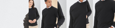 - Coverstitched collar, shoulders, armholes, ribbed cuffs and waistband